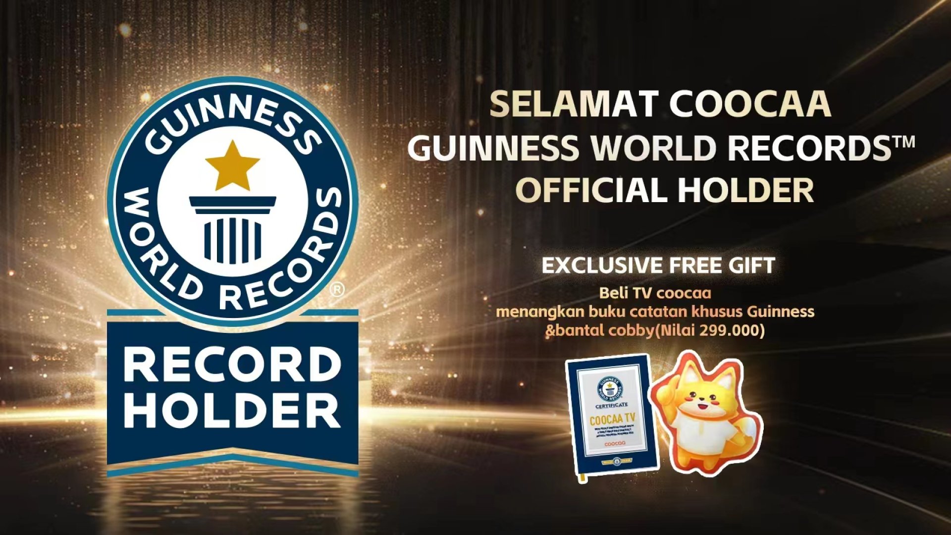 Hadiah istimewa juga tersedia pada momen spesial yang merayakan pencapaian bersejarah tersebut. Dalam rangka Guinness World Record, coocaa membagikan 1.000 notebook bertema Guinness dan 200 bantal berbentuk maskot coocaa, "Cobby", dengan tema Guinness bagi konsumen secara online dan offline. Agar suasana semakin meriah, berbagai hadiah lain turut dibagikan coocaa, seperti paket langganan Netflix dan game controller. Setiap hadiah dari coocaa didedikasikan untuk setiap konsumen dan pendukung. Lebih lagi, semua hadiah ini menjadi bentuk apresiasi atas perhatian, pilihan, dan dukungan konsumen terhadap coocaa. Anda dapat bergabung bersama coocaa, serta membuat Desember ini menjadi momen yang berkesan dan meriah